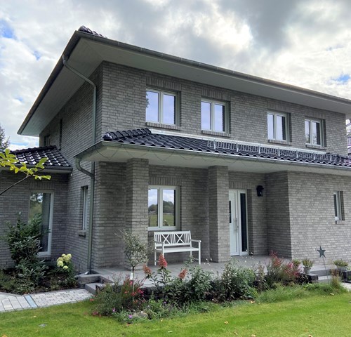 Das Klinkerriemchen K374R in der Farbe grau gedämpft und im Format WDF (210x20x65 mm) und einem Bedarf von 56 Stück pro Quadratmeter ist die perfekte Wahl für eine individuelle und hochwertige Fassadengestaltung. Dank seiner hohen Widerstandsfähigkeit gegenüber Witterungseinflüssen, Frost und Verschmutzungen bietet das Klinkerriemchen K374R eine langlebige, pflegeleichte und nachhaltige Lösung. Durch den Brand bei hohen Temperaturen erhält das Klinkerriemchen K374R seine charakteristische Festigkeit sowie eine dauerhaft brillante Farbbeständigkeit. Egal ob Neubau oder Sanierung – das Klinkerriemchen K374R verleiht jeder Fassade einen modernen und zugleich zeitlosen Look.